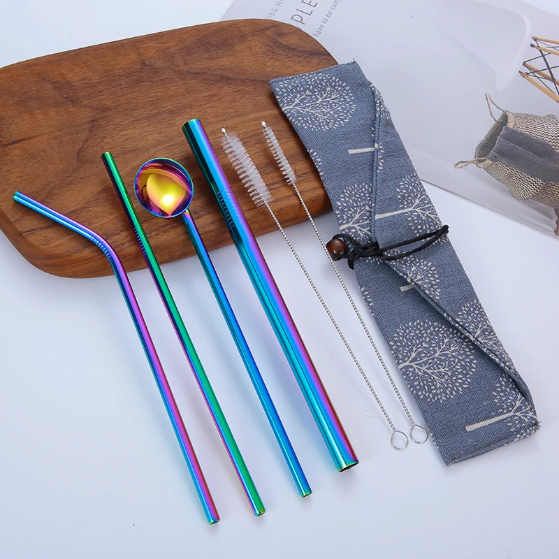 Coupon 6pcs Stainless Steel Drink Straw Spoon Set with Bag Cleaner Brush Reusable Rainbow Bent Straight Dr